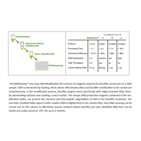 Methylamp one-Step DNA Modification Kit je kompletní sada nezbytných komponent, určených k analýze methylace DNA při použití Epigentek jednodušší a efektivnější bisulfite metody. Celý postup zvládnete během pouhé 1 hodiny a 45 minut s perfektními výsledky. Methylamp one-Step DNA Modification Kit je vhodný pro MS-PCR, real time MS-PCR, methylation sequencing, a pyrosequencing i methylation microarray.